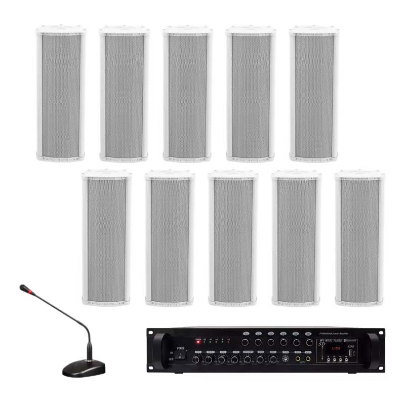 Bộ hệ thống 10 loa cột thường bao gồm 10 loa, amply công suất, micro thông báo và các thiết bị kết nối đồng bộ. Cấu hình này phù hợp cho nhà xưởng có diện tích lớn, nhiều khu vực phân chia, giúp phát thông báo đồng đều và không bị mất tiếng ở các vị trí xa.