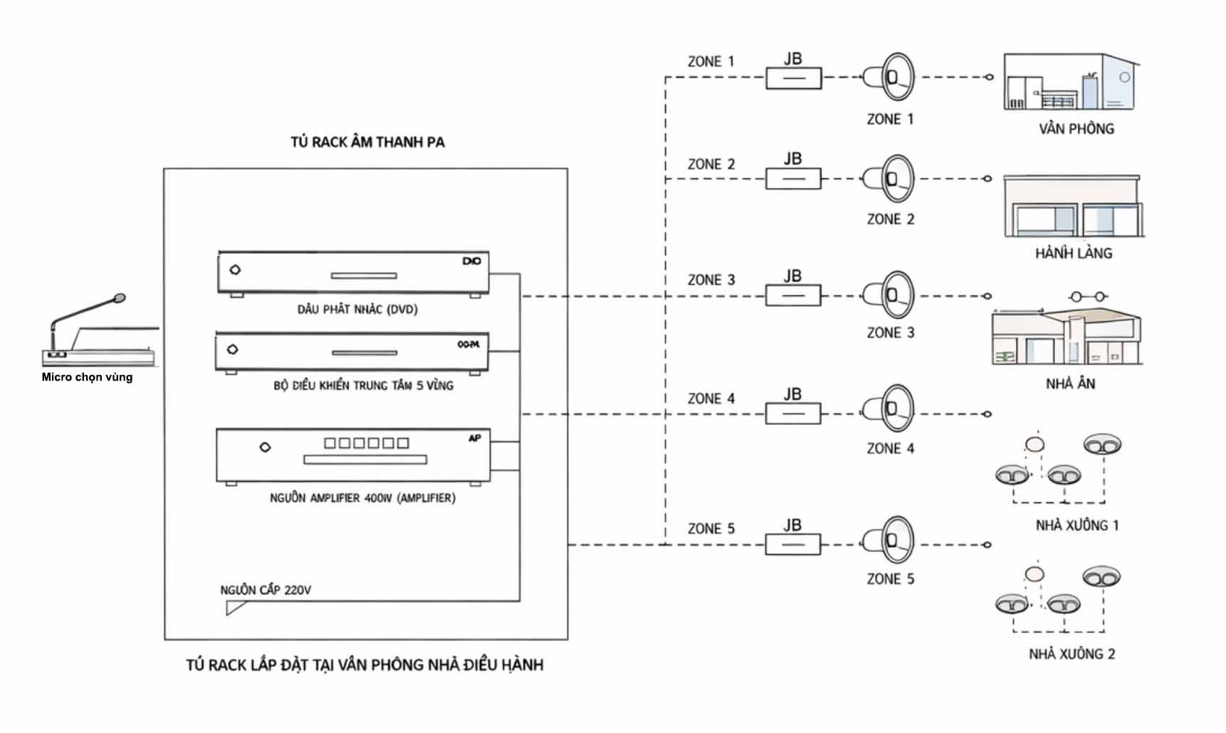 Sơ đồ nguyên lý hệ thống thông báo cho nhà xưởng 5 vùng loa