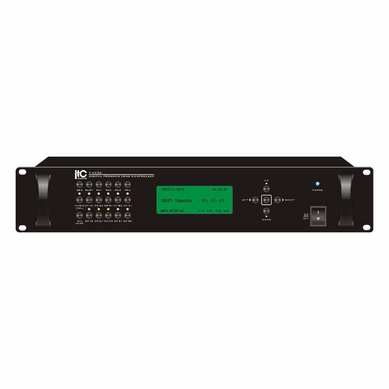 Bộ hẹn giờ và phát lại âm thanh ITC T-6232 là giải pháp chuyên nghiệp cho hệ thống âm thanh thông báo và nhạc nền nhiều khu vực như văn phòng, trung tâm thương mại, trường học, khách sạn, nhà xưởng. Thiết bị tích hợp sẵn bộ hẹn giờ hàng tuần (weekly timer), chức năng phát lại MP3 và điều khiển phân vùng tới 10 vùng ban đầu và có thể mở rộng tới 160 vùng.