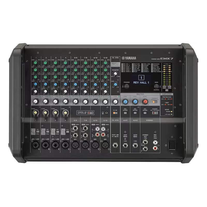 Yamaha EMX7 là dòng mixer kèm công suất được thiết kế dành cho các dàn âm thanh chuyên nghiệp, hội trường, sân khấu vừa và nhỏ. Với công suất mạnh mẽ tích hợp sẵn, thiết bị này giúp giảm thiểu nhu cầu dùng thêm cục đẩy công suất rời, tiết kiệm chi phí và không gian lắp đặt. Đây là lựa chọn lý tưởng cho những ai cần một giải pháp gọn gàng, hiệu quả mà vẫn đảm bảo chất lượng âm thanh tối ưu.